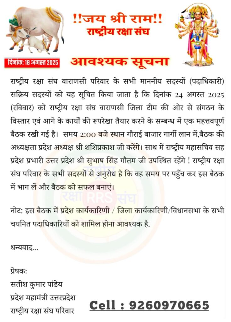 वाराणसी/-राष्ट्रीय रक्षा संघ वाराणसी परिवार के सभी माननीय सदस्यों (पदाधिकारी) सक्रिय सदस्यों को यह सूचित किया जाता है कि आगामी 24 अगस्त 2025 रविवार को राष्ट्रीय रक्षा संघ वाराणसी जिला टीम की ओर से संगठन के विस्तार एवं आगे के कार्यों की रूपरेखा तैयार करने के सम्बन्ध में एक महत्तवपूर्ण बैठक रखी गई है। समय दो बजे स्थान गोराई बाजार गार्गी लान में बैठक की अध्यक्षता प्रदेश अध्यक्ष श्री शशिप्रकाश जी करेंगे।