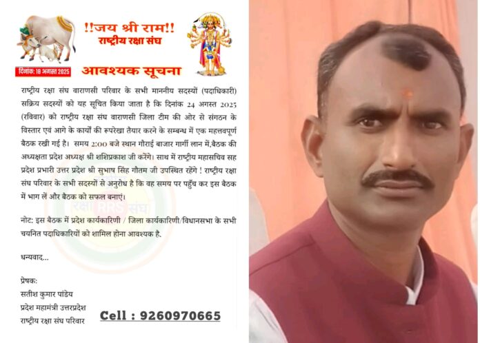 वाराणसी/-राष्ट्रीय रक्षा संघ वाराणसी परिवार के सभी माननीय सदस्यों (पदाधिकारी) सक्रिय सदस्यों को यह सूचित किया जाता है कि आगामी 24 अगस्त 2025 रविवार को राष्ट्रीय रक्षा संघ वाराणसी जिला टीम की ओर से संगठन के विस्तार एवं आगे के कार्यों की रूपरेखा तैयार करने के सम्बन्ध में एक महत्तवपूर्ण बैठक रखी गई है। समय दो बजे स्थान गोराई बाजार गार्गी लान में बैठक की अध्यक्षता प्रदेश अध्यक्ष श्री शशिप्रकाश जी करेंगे।