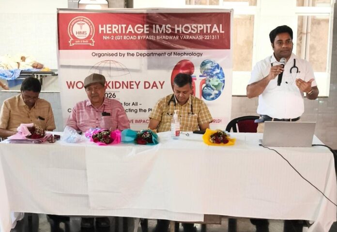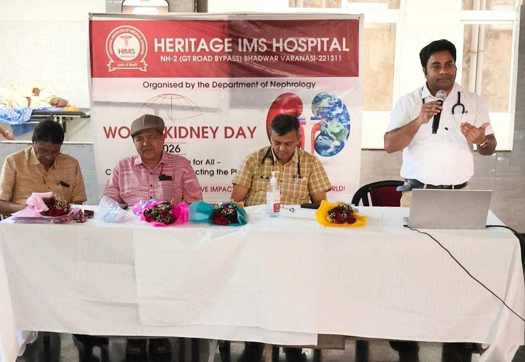 वाराणसी/-भदवर स्थित हेरिटेज आईएमएस हॉस्पिटल ने वर्ल्ड किडनी डे के अवसर पर लोगों को किडनी संबंधी बीमारियों के प्रति जागरूक करने के लिए एक संगोष्ठी का आयोजन किया गया।इस कार्यक्रम में अस्पताल के वरिष्ठ डॉक्टर,स्टाफ और छात्रों ने बढ़-चढ़कर हिस्सा लिया।प्रमुख रूप से किडनी रोग विभाग से प्रो डॉ राणा गोपाल सिंह,डॉ डी के सिन्हा,डॉ योगेश गौर व यूरोलॉजी विभाग से डॉ हिमांशु पांडे, डॉ स्वातंक मिश्रा,डॉ शुभंकर गौतम,वरिष्ठ शिशु रोग विशेषज्ञ डॉ ओ पी मिश्रा सहित कई विशेषज्ञ उपस्थित रहे।संगोष्ठी मे पोस्टरों व वीडियो प्रेजेंटेशन के माध्यम से किडनी की बीमारियों की रोकथाम और उपचार के बारे में जानकारी दी गई।अस्पताल में आए मरीजों का निशुल्क ब्लड प्रेशर,शुगर,यूरिक एसिड सहित कई जरूरी जांचें की गईं।यह आयोजन किडनी की सेहत को लेकर लोगों को जागरूक करने और स्वस्थ जीवनशैली अपनाने के महत्व को समझाने की दिशा में एक महत्वपूर्ण कदम साबित हुआ।