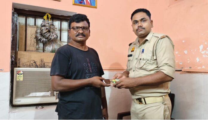 वाराणसी/-श्रीनिवासन राव निवासी बोबली विजयनगरम आंध्र प्रदेश अपने परिवार के साथ वाराणसी के दशाश्वमेध घाट पर गंगा आरती देखने आए थे उस दौरान उनकी बहन लक्ष्मी राव का आईफोन मोबाइल खो गया था जो थाना दशाश्वमेध के आरक्षी दिनेश कुमार को मिला उसके बाद इस मोबाइल को श्रीनिवासन राव से संपर्क कर उन्हें सुपुर्द किया।सराहनीय कार्य के लिए परिजनों नें कांस्टेबल दिनेश कुमार को धन्यवाद दिया वाराणसी पुलिस का आभार
