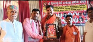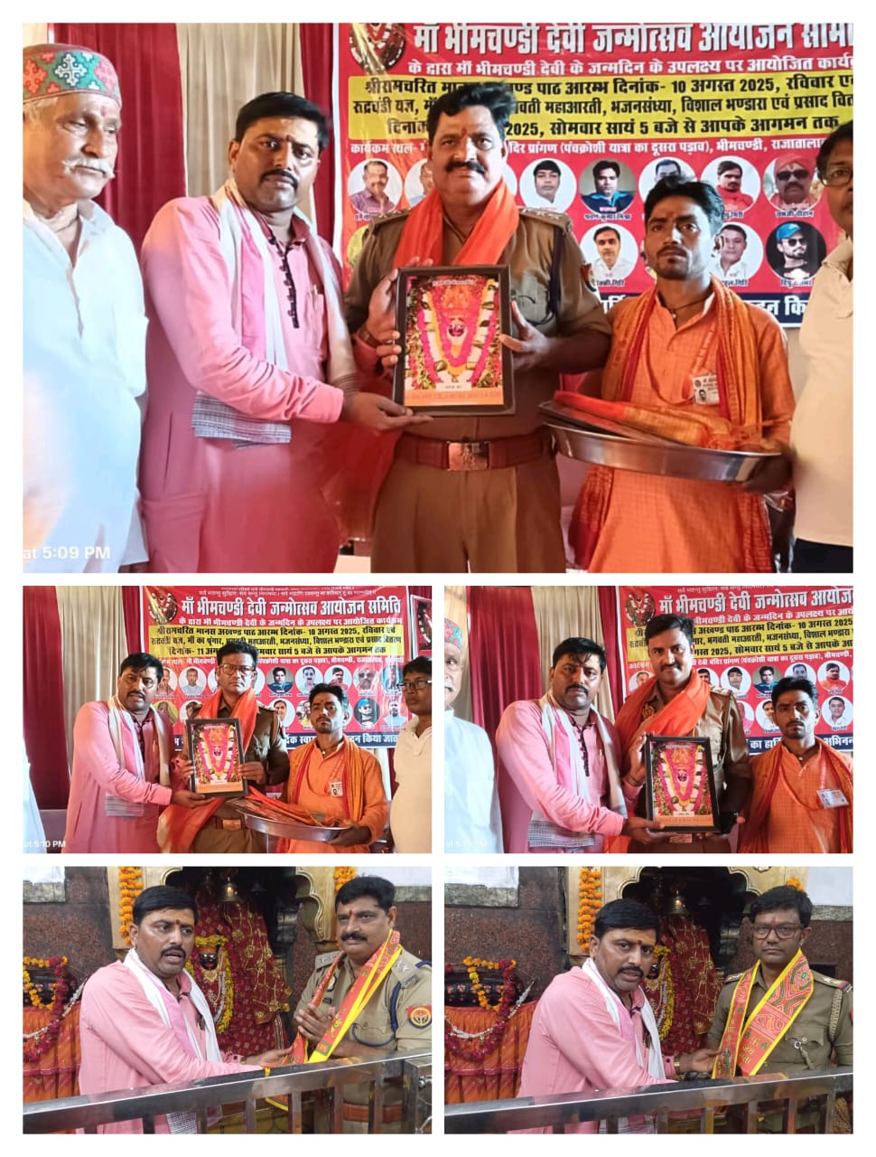 अधिकारियों में क्रमशः सहायक पुलिस आयुक्त राजातालाब अजय कुमार श्रीवास्तव,थानाध्यक्ष राजातालाब राजू कुमार सहित चौकी प्रभारी कस्बा राजातालाब रोहित दूबे को अंग वस्त्र व माँ भीमचंडी देवी का फोटो देकर कार्यक्रम प्रबंधन ने सम्मानित किया।