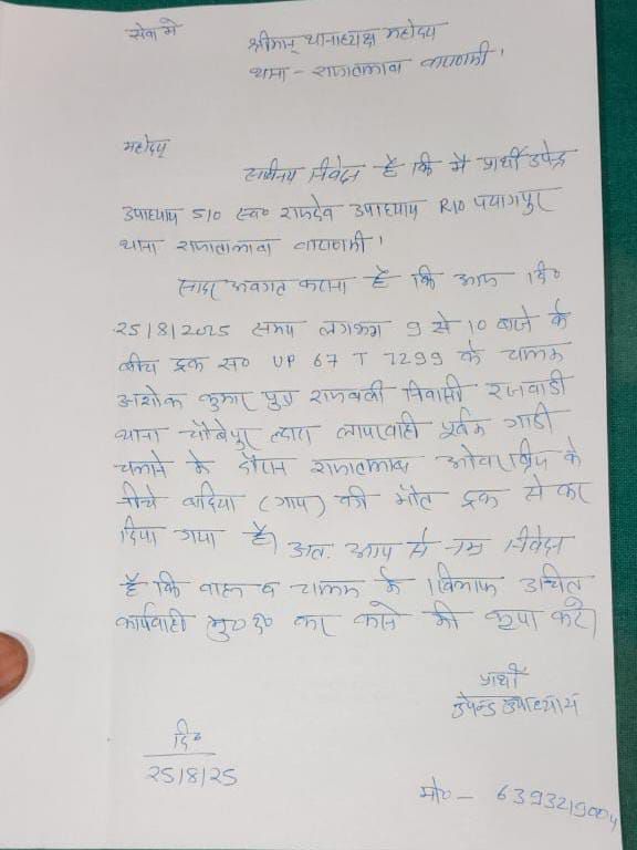 प्राप्त जानकारी के मुताबिक राजातालाब थाना क्षेत्र के पयागपुर निवासी उपेन्द्र उपाध्याय ने चौकी प्रभारी कस्बा राजातालाब रोहित दूबे को दिए हुए तहरीर में बताया कि ट्रक संख्या UP 67 T 7299 के चालक अशोक कुमार पुत्र राजबली निवासी रजवाड़ी थाना चौबेपुर द्वारा लापरवाही पूर्वक वाहन ट्रक चलाते हुए बेजुबान गाय को मौत के घाट उतार दिया।