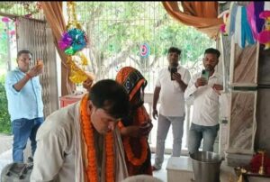 वाराणसी/-राजातालाब में एक पति ने पत्नी को प्रेमी के साथ कमरे में रंगे हाथ पकड़ ल‍िया इसके बाद परिजनों को बुलाकर पत्नी की उसके प्रेमी के साथ ही शादी भी करा दी।उसके प्रेमी के साथ राजातालाब थाना क्षेत्र के बीरभानपुर स्थित हनुमान मंदिर परिसर में प्रेमी प्रेमिका ने एक-दूसरे को वरमाला पहनाई तथा ब्राह्मणों द्वारा विधि विधान से मंत्र उच्चारण के साथ सिंदूरदान कर शादी कराई गयी।मंदिर की ओर से शादी का प्रमाणपत्र भी जारी किया गया।क्षेत्र में इस वाकये की चर्चा हो रही है।