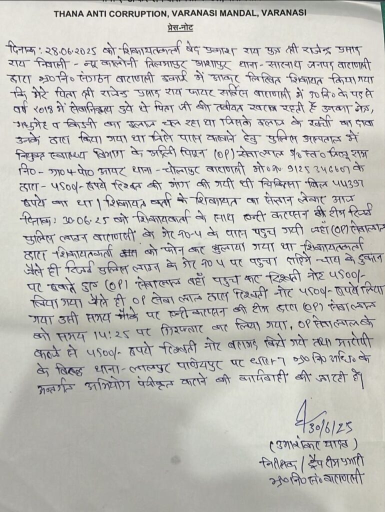 प्राप्त जानकारी के अनुसार शिकायतकर्ता वेद प्रकाश राय पुत्र राजेन्द्र प्रसाद राय निवासी न्यू कॉलोनी तिलमापुर,आशापुर थाना सारनाथ ने 28 जून 2025 को एंटी करप्शन संगठन,वाराणसी कार्यालय में लिखित शिकायत दर्ज कराई थी।उन्होंने बताया कि उनके पिता राजेन्द्र प्रसाद राय वर्ष 2018 में फायर सर्विस से 30 वर्ष की सेवा के बाद सेवानिवृत्त हुए थे।उनकी तबीयत खराब रहने के कारण मधुमेह और किडनी संबंधी इलाज का खर्च 44,397 रुपये का बिल दावा स्वरूप प्रस्तुत किया गया था।इस बिल को पास करवाने के एवज में पुलिस अस्पताल में तैनात ओपी सेवालाल निवासी ग्राम जिल्हूराम,पोस्ट आपर,थाना चोलापुर द्वारा 5900 रुपये की रिश्वत की मांग की गई थी।