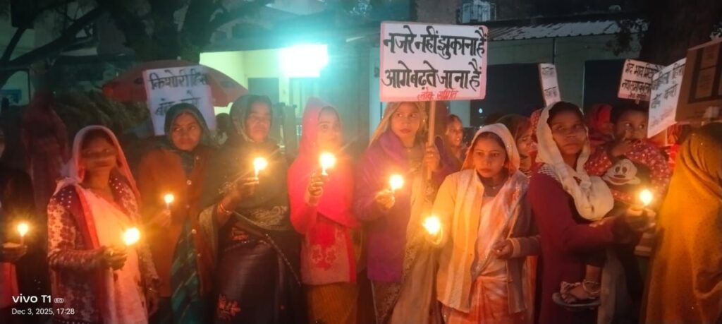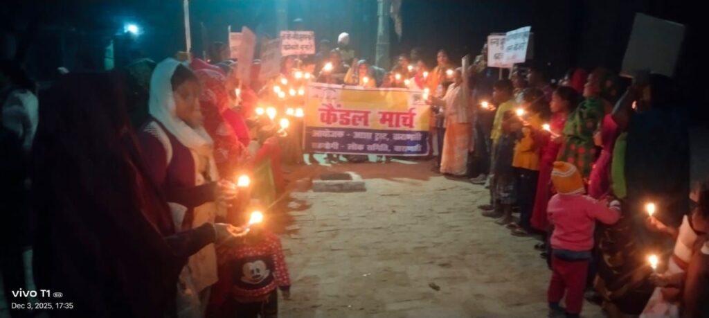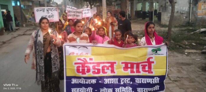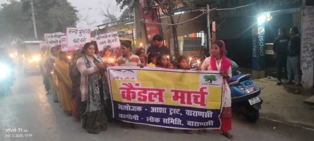 वाराणसी/-लोक समिति व आशा ट्रस्ट के संयुक्त तत्वावधान में घरेलू महिला हिंसा के खिलाफ सैकड़ो महिलाए और युवाओ ने बुधवार को कपरफोड़वा लहिया बाजार में कैंडल मार्च निकाला।जुलूस में शामिल महिलाओं ने महिला हिंसा के खिलाफ आवाज उठाई।