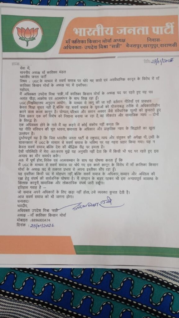 वाराणसी/-यूजीसी (विश्वविद्यालय अनुदान आयोग) के माध्यम से भारतीय जनता पार्टी की केंद्र सरकार द्वारा लागू की जा रही नीतियों को सर्वर्ण समाज के अधिकारों पर सीधा हमला बताते हुए माँ कालिका किसान मोर्चा के अध्यक्ष एवं अधिवक्ता उपदेश मिश्रा ‘सन्नी’ ने अपने पद से इस्तीफा दे दिया।उन्होंने यह इस्तीफा मंडल अध्यक्ष विवेक सिंह को सौंपते हुए सरकार की नीतियों के खिलाफ तीखा विरोध दर्ज कराया।अधिवक्ता उपदेश मिश्रा ने कहा कि यूजीसी के जरिए जो व्यवस्था थोपी जा रही है,वह शिक्षा सुधार नहीं बल्कि योजनाबद्ध तरीके से एक वर्ग को हाशिये पर धकेलने की साजिश है।योग्यता,परिश्रम और समान अवसर जैसे संवैधानिक मूल्यों को कुचलकर समाज में असंतुलन पैदा किया जा रहा है।