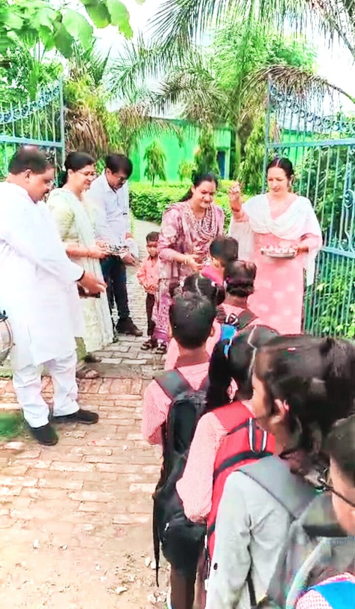 वाराणसी/-ग्रीष्मावकाश के बाद पहले दिन बच्चों के लिए स्कूल खुलने पर ड्रम की थाप,पुष्प वर्षा,तिलक एवं चॉकलेट वितरित कर शिक्षकों तथा माता समिति ने बच्चों का किया स्वागत।बच्चों ने भी गुरुजनों का आशीर्वाद लेकर अपनी शिक्षा पूर्ण कर आगे अपने अभिभावकों सहित विद्यालय का नाम रौशन करने का लिया संकल्प।प्रथम दिन 65% उपस्थित रही।कक्षा 1,2 एवं 3 के बच्चों के बीच निःशुल्क पुस्तक वितरित किया गया,जिससे बच्चों में ख़ुशी का माहौल रहा तथा