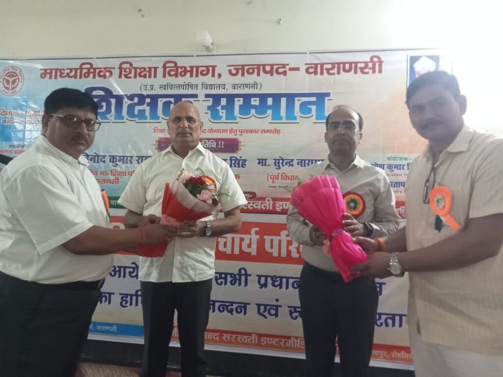 वाराणसी/-शिक्षक दिवस पर गोविंदपुर रोहनिया स्थित स्वामी श्रद्धानंद सरस्वती इंटरमीडिएट कॉलेज में संयोजक प्रधानाचार्य देवेंद्र प्रताप सिंह गोपाल की उपस्थिति में शिक्षक सम्मान समारोह कार्यक्रम का आयोजन किया गया।जिसमें मुख्य अतिथि डॉ विनोद कुमार राय अपर सचिव माध्यमिक शिक्षा परिषद वाराणसी तथा भोलेंद्र प्रताप सिंह जिला विद्यालय निरीक्षक ने वाराणसी जिले के विभिन्न कॉलेजों से आए शिक्षकों को अंग वस्त्र व प्रशस्ति पत्र के साथ स्मृति चिन्ह देखकर सम्मानित किया।