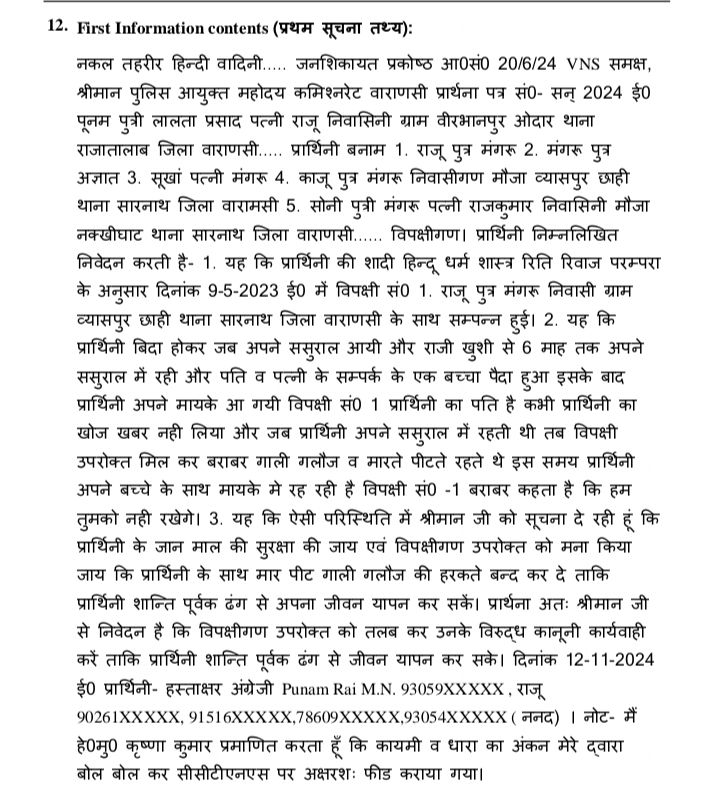 प्राप्त जानकारी के अनुसार विवाहिता पूनम ने पुलिस आयुक्त वाराणसी मोहित अग्रवाल को तहरीर देकर पति सहित ससुराल के पाँच लोगो के खिलाफ कार्यवाही की माँग की और बताया कि जब से वह मायके में रह रही है तब से आज तक ना तो पति और ना ही ससुराल के लोगो द्वारा हमारी हाल खबर ली गयी हमारे पास एक बच्चा भी है।