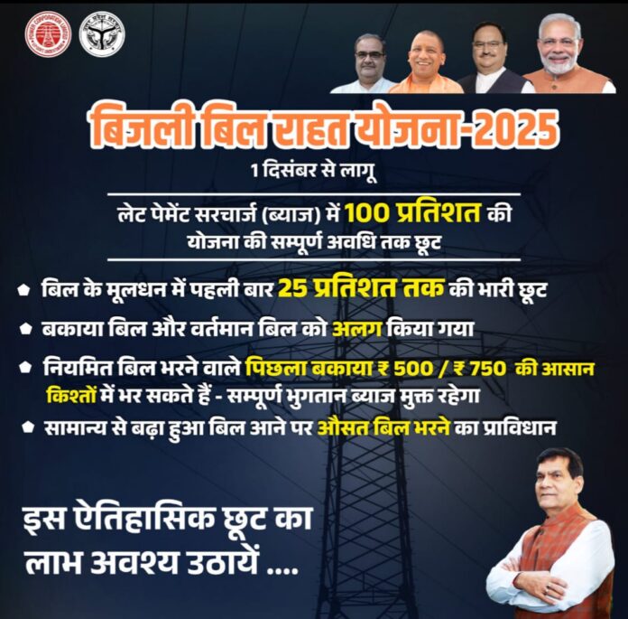 वाराणसी/-सम्मानित विद्युत उपभोक्ताओं को सूचित किया जाता है कि उत्तर प्रदेश पावर कारपोरेशन लिमिटेड द्वारा दिनांक 1 दिसम्बर 2025 से विद्युत बिल बकायेदारों के लिए बिजली बिल राहत योजना 2025-26 प्रारम्भ की जा रही है जो तीन चरणों (प्रथम चरण दिनांक 1 दिसम्बर 2025 से 31 दिसम्बर 2025 तक,द्वितीय चरण-दिनांक 1 जनवरी 2026 से 31 जनवरी 2026 तक एवं तृतीय चरण-दिनांक 1 फरवरी 2026 से 28 फरवरी 2026 तक) में होगी जिसमें एक किलो वाट एवं दो किलो वाट के समस्त घरेलू एवं एक किलो वाट के वाणिज्यिक श्रेणी के उपभोक्ताओं जिनका अंतिम भुगतान 31 मार्च 2025 के पूर्व हुआ है