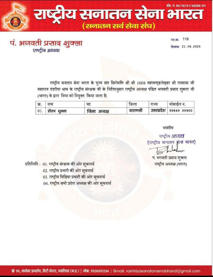 वाराणसी/-राष्ट्रीय सनातन सेना भारत के पूज्य संत सिरोमणि श्री श्री 1008 महामण्डलेस्वर श्री रामदास जी महाराज दंदरौया धाम के राष्ट्रीय संरक्षक जी के निर्देशानुसार शनिवार को राष्ट्रीय अध्यक्ष पंडित भगवती प्रसाद शुक्ला जी (भारत) के द्वारा वाराणसी जनपद के बड़ौरा निवासी प्रीतम शुक्ला को जिलाध्यक्ष वाराणसी के पद की अहम जिम्मेदारी दी गयी है।आपको बता दे कि नवागत जिलाध्यक्ष वाराणसी बीते वर्ष 2010 से सक्रिय राजनीति में है,वर्ष 2010 में ग्राम सभा बड़ौरा से क्षेत्र पंचायत सदस्य चुने गए थे पुनः दोबारा वर्ष 2020 में क्षेत्र पंचायत देईपुर से भारी मतों से क्षेत्र पंचायत सदस्य चुने गए है जनपद वाराणसी में तीसरा स्थान व ब्लाक में पहला स्थान था और सर्वाधिक मतों से बीडीसी का चुनाव जीते है।वर्तमान समय में प्रीतम शुक्ला भारतीय जनता पार्टी किसान मोर्चा में जिला मंत्री के रूप में जनता की सेवा कार्य कर रहे है उसके बाद उनके कार्यो को देखते हुए राष्ट्रीय सनातन सेना भारत के शीर्ष नेतृत्व द्वारा वाराणसी जिलाध्यक्ष के पद की अहम जिम्मेदारी इस लिए दी गयी है कि वाराणसी माननीय प्रधानमंत्री व काशी के सांसद नरेन्द्र मोदी जी की संसदीय क्षेत्र है और यह देवो के देव महादेव की नगरी काशी भी है जहाँ देश-विदेश से लोग मोक्ष कामना हेतु आते है वाराणसी में माँ गंगा,मणिकर्णिका घाट,नमो घाट,काशी विश्वनाथ धाम,माँ अन्नपूर्णा धाम,काशी कोतवाल काल भैरव,संकट मोचन,दुर्गाकुंड जैसी विश्व विख्यात व पर्यटन क्षेत्र है और नवागत जिलाध्यक्ष वाराणसी के क्षेत्र में ही अंतरराष्ट्रीय क्रिकेट स्टेडियम का भी शिलान्यास माननीय प्रधानमंत्री के कर कमलों द्वारा किया गया है और युद्धस्तर पर निर्माण कार्य जारी है।