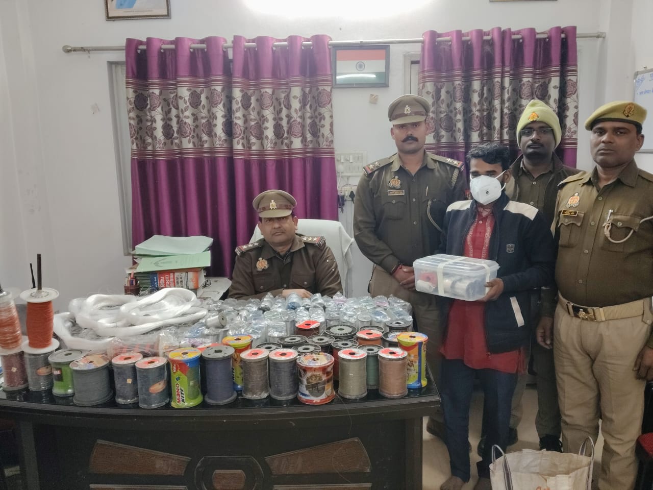 वाराणसी/-पुलिस आयुक्त वाराणसी मोहित अग्रवाल के प्रतिबन्धित चायनीज मांझा की बिक्री खरीद एवं प्रयोग पर रोकथाम के लिए चलाये जा रहे अभियान के क्रम में पुलिस उपायुक्त वरुणा जोन प्रमोद कुमार के निर्देशन मे अपर पुलिस उपायुक्त वरुणा जोन नीतू कादयान के पर्यवेक्षण में एवं सहायक पुलिस आयुक्त रोहनिया संजीव कुमार शर्मा के कुशल नेतृत्व में रोहनिया पुलिस टीम द्वारा मुखबिर की सूचना पर दुकान में प्रतिबंधित चाइनीज मांझा के विक्रेता राहुल कान्त पुत्र जगदीश निवासी ग्राम बच्छाव थाना रोहनिया वाराणसी को सोमवार रात के समय बच्छाव बाजार के पास स्थित दुकान से 45 किलो 400 ग्राम प्रतिबन्धित चाईनीज मांझा के साथ गिरफ्तार कर पर्यावरण संरक्षण अधिनियम के तहत मुकदमा दर्ज करते हुए मंगलवार को जेल भेज दिया गया।वही इस बाबत प्रभारी निरीक्षक रोहनिया राजू सिंह का कहना रहा कि यह कार्यवाही मकर संक्रांति पर्व से पहले की गई है,जब पतंगबाजी के लिए इस प्रतिबंधित मांझे का उपयोग बढ़ने की आशंका होती है।मानव और पशु-पक्षियों की जान बचाने के लिए चाइनीज मांझा बेचने वालों के खिलाफ जिले में अभियान चलाया जा रहा है।रोहनिया पुलिस ने आमजन से अपील की है कि धातुओं के मिश्रण से बने चाइनीज मांझे का उपयोग न करें,क्योंकि इससे दुपहिया वाहन चालकों और पक्षियों को जान-माल का अत्यधिक नुकसान होने की संभावना रहती है।गिरफ्तारी व बरामदगी करने वाले पुलिस टीम में मुख्य रूप से प्रभारी निरीक्षक रोहनिया राजू सिंह,उप निरीक्षक चौकी प्रभारी अखरी विशाल कुमार सिंह,उप निरीक्षक श्याम बाबू,हेड कांस्टेबल अमरनाथ यादव,हेड कांस्टेबल शिव प्रकाश यादव,हेड कांस्टेबल वेद प्रकाश राय,हेड कांस्टेबल चन्द्रदीप मौर्या,कांस्टेबल अरविन्द यादव शामिल रहे।
