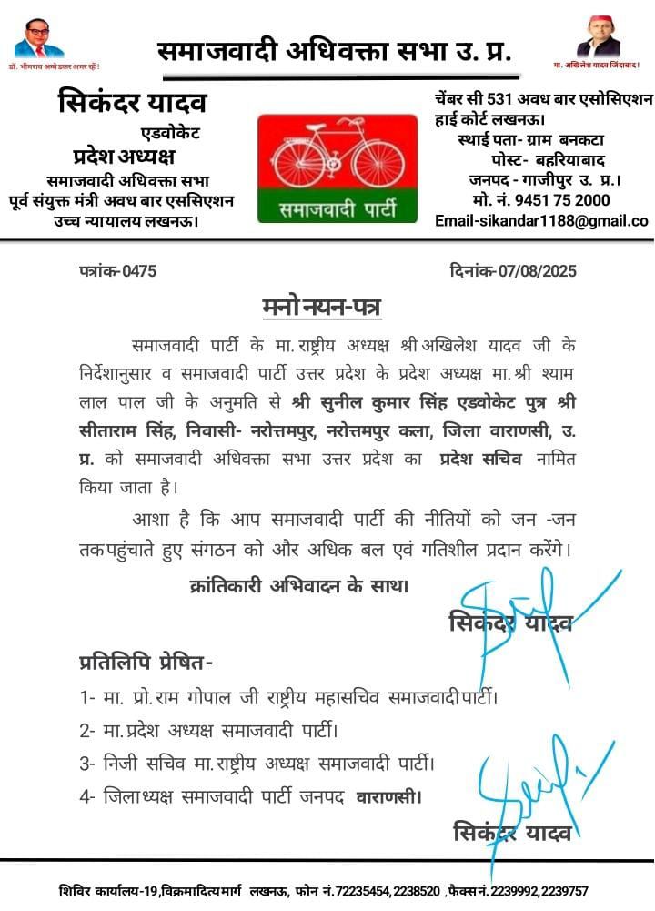 सुनील कुमार सिंह को समाजवादी पार्टी ने दी वाराणसी में बड़ी जिम्मेदारी बनाये गए सपा अधिवक्ता सभा यूपी के प्रदेश सचिव बधाईयो का लगा तांता
