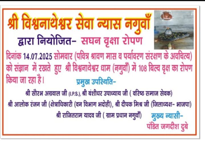 वाराणसी/-जनपद भदोही के नगुवाँ गाँव मे आगामी सोमवार यानी 14 जुलाई 2025 को (पवित्र श्रावण मास व पर्यावरण संरक्षण के अवचित्य) को संज्ञान में रखते हुए श्री विश्वनाथेश्वर धाम (नगुवाँ) में एक सौ आठ बिल्व वृक्ष का रोपण किया जायेगा।वृक्षारोपण कार्यक्रम में मुख्य रूप से सौरभ अग्रवाल जी (आईपीएस),बंशीधर उपाध्याय जी (वरिष्ठ समाज सेवक)आलोक रंजन जी (क्षेत्राधिकारी वन विभाग भदोही),दीपक मिश्र जी (जिलाध्यक्ष भाजपा) राजितराम यादव जी ( ग्राम प्रधान नगुवाँ) व मुख्य न्यासी पंडित जगदीश दुबे सहित सैकड़ो लोग उपस्थित होकर कार्यक्रम को सफल बनाने में अपना अपना महत्वपूर्ण योगदान सुनिश्चित करेंगे।