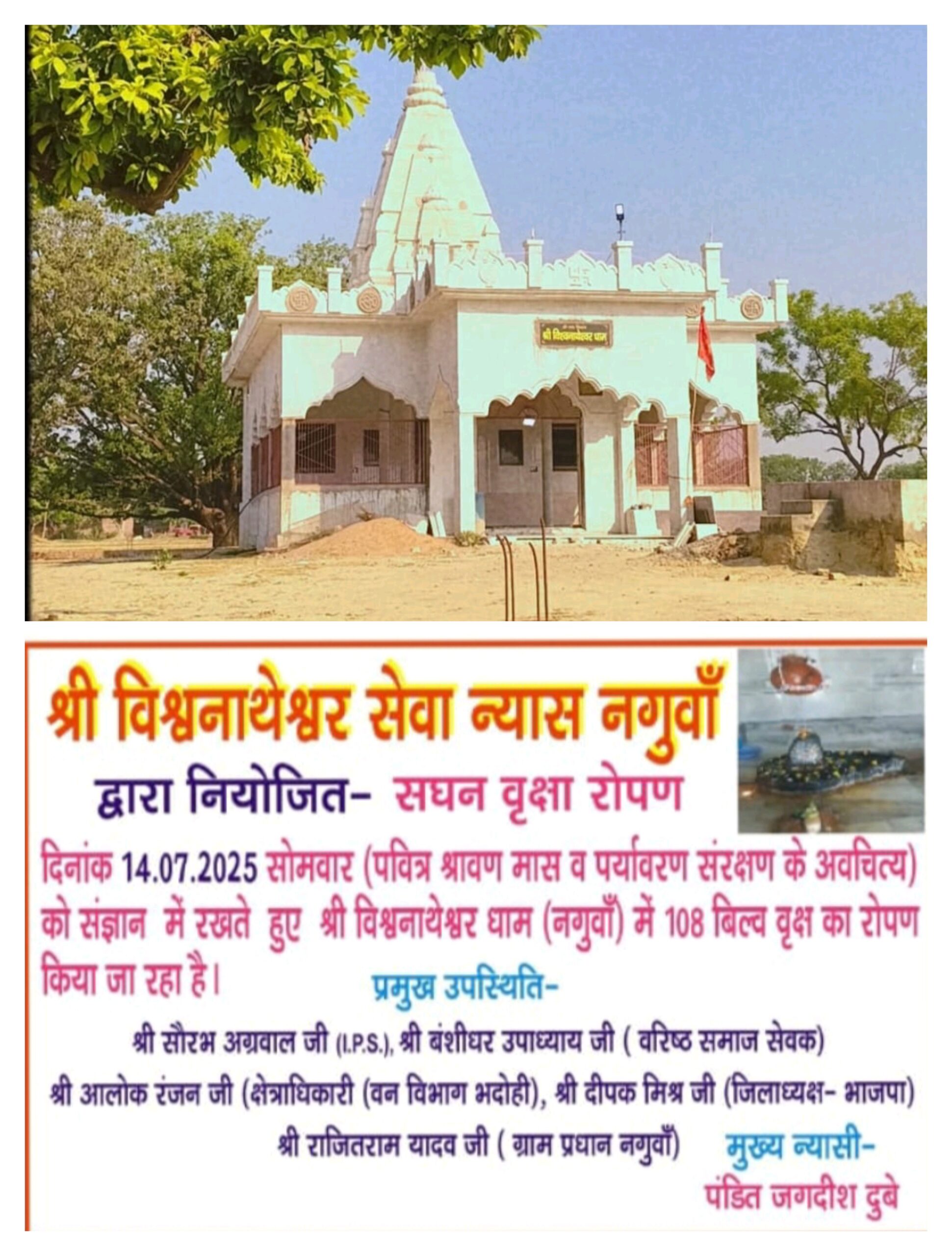 वाराणसी/-जनपद भदोही के नगुवाँ गाँव मे आगामी सोमवार यानी 14 जुलाई 2025 को (पवित्र श्रावण मास व पर्यावरण संरक्षण के अवचित्य) को संज्ञान में रखते हुए श्री विश्वनाथेश्वर धाम (नगुवाँ) में एक सौ आठ बिल्व वृक्ष का रोपण किया जायेगा।वृक्षारोपण कार्यक्रम में मुख्य रूप से सौरभ अग्रवाल जी (आईपीएस),बंशीधर उपाध्याय जी (वरिष्ठ समाज सेवक)आलोक रंजन जी (क्षेत्राधिकारी वन विभाग भदोही),दीपक मिश्र जी (जिलाध्यक्ष भाजपा) राजितराम यादव जी ( ग्राम प्रधान नगुवाँ) व मुख्य न्यासी पंडित जगदीश दुबे सहित सैकड़ो लोग उपस्थित होकर कार्यक्रम को सफल बनाने में अपना अपना महत्वपूर्ण योगदान सुनिश्चित करेंगे।