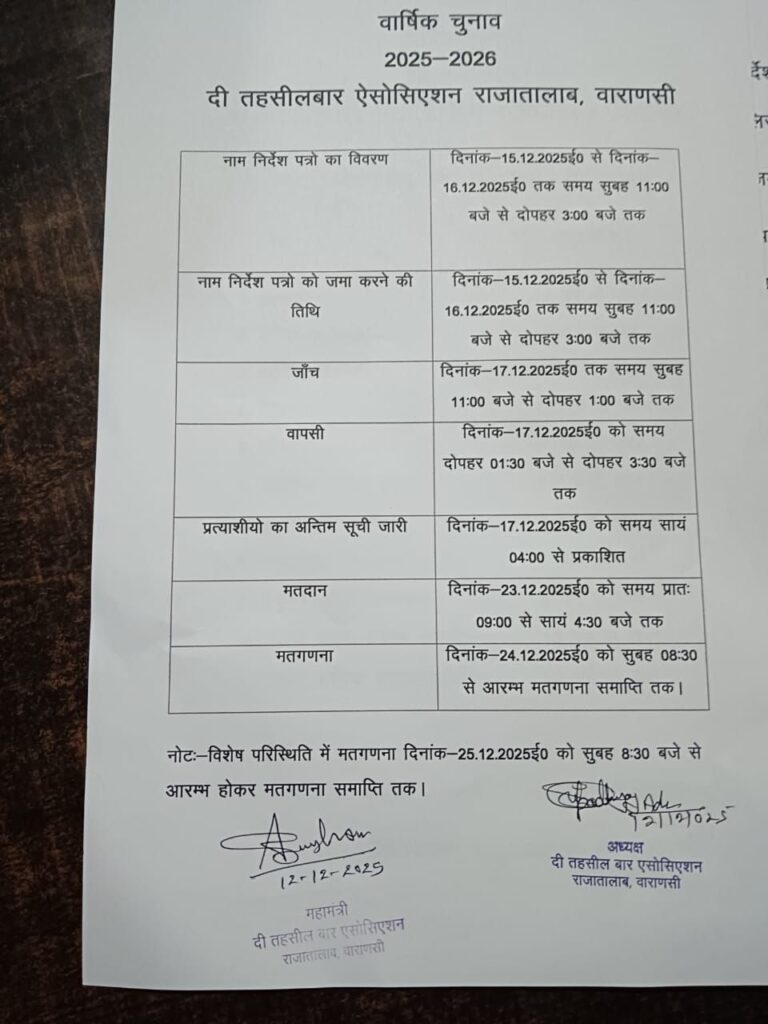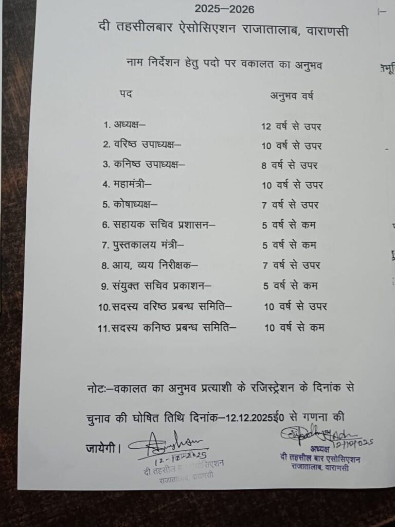 वाराणसी/-दी तहसील बार एसोसिएशन राजातालाब वाराणसी वार्षिक चुनाव 2026 की चुनाव प्रक्रिया आज से शुरू हो जाएगी चुनाव संपन्न करने के लिए पांच सदस्यों की चुनाव संचालन समिति बनाई गई है।