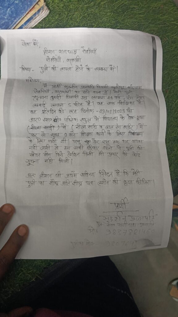 वह प्रतिदिन की तरह बीते 23 फरवरी 2026 को आरएसबी पब्लिक स्कूल पण्डितपुर में विद्यालय के वेष-भूषा (नीला साड़ी) में (नीला साड़ी व लाल रंग बार्डर) में घर से सुबह 9 बजे शिक्षण कार्य के लिए विद्यालय के लिए गयी थी।परन्तु देर रात तक घर वापस नहीं आयी तो हम सभी परिवार वालो ने पुत्री की खोजबीन किये लेकिन किसी भी प्रकार की कोई सूचना नहीं मिली।रोहनिया पुलिस ने तहरीर लेकर जाँच पड़ताल में जुट गई है।