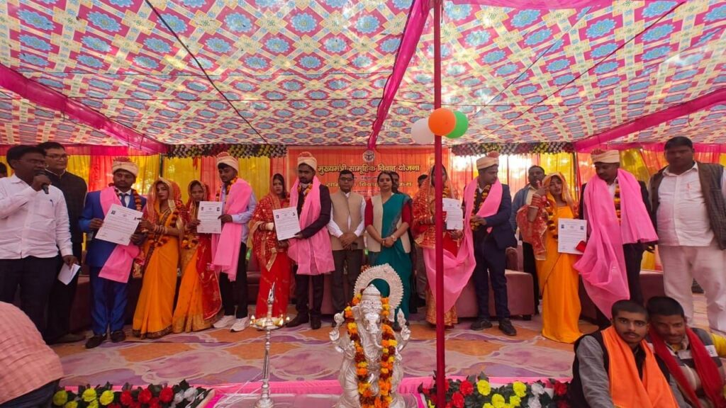 वाराणसी/ जोड़ियाँ स्वर्ग में बनती हैं पर उन्हें धरती पर मिलाकर हम पुण्य के भागी बनते हैं।उक्त बातें हरहुआ ब्लाक मुख्यालय परिसर में आयोजित मुख्यमंत्री सामूहिक विवाह योजना अंतर्गत 53 जोड़ों जो एक दूजे के होकर दाम्पत्य जीवन शुरू करने जा रहे वर-वधु को आशीर्वाद देने के बाद बतौर मुख्य अतिथि जिला पंचायत अध्यक्ष पूनम मौर्या ने अपने सम्बोधन में व्यक्त किया।सभी जोड़ो को अपने हाथों उपहार सामग्री व प्रमाण पत्र प्रदान किया।जिला पंचायत अध्यक्ष पूनम मौर्या का बीडीओ हरहुआ बद्री प्रसाद वर्मा ने बुके भेंटकर स्वागत किया और पगड़ी बांधकर मंगल गणेश पूजन का कार्य कराया।साथ ही प्रांगण में स्थित सरदार पटेल,अम्बेडकर व पंडित दीन दयाल के मूर्ति पर माल्यार्पण व दीप प्रज्वलित किया।कार्यक्रम में शामिल 52 जोड़े हिन्दू रीति रिवाज से वैदिक मंत्रोच्चार हवन के बाद एक दूजे के गले मे जयमाला डालकर संकल्प लिया वहीँ महिलाओं ने मंगलगीत गाकर परम्परा को जीवंत बना दिया।वहीं एक सभईपुर के मुस्लिम जोड़े का मौलबी ने निकाह पढ़ाया।अध्यक्षता करते हुए बीडीओ हरहुआ श्री वर्मा ने कहा कि आज असहाय,गरीबों के लिए महंगी हो गई है जो सरकार के आर्थिक सहयोग से उनके लिए वरदान साबित हुई है।सामूहिक शादी में सरकार प्रति शादी एक लाख रुपये खर्च कर रही है जिसमें साठ हजार लड़की के खाते में तथा 25000 का सामान एवं 15000 रुपए टेंट खाने पीने आदि के खर्चे पर व्यय किया गया।
