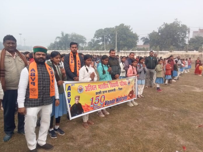 वाराणसी/-अखिल भारतीय विद्यार्थी परिषद वाराणसी जिला द्वारा सरदार पटेल इंटर कॉलेज बढ़ैनी में “वंदे मातरम” का सामूहिक गायन किया गया जिसमें 2000 से अधिक छात्र छात्राओं ने गायन किया।जिला संयोजक राजमंगल सिंह ने कहा कि वंदे मातरम 150 साल एक अवसर है कि हम इस गीत से प्रेरणा ले और 2047 तक विकसित भारत बनाएं यह गीत आज भी एकता और आत्मनिर्भरता सिखाता है।