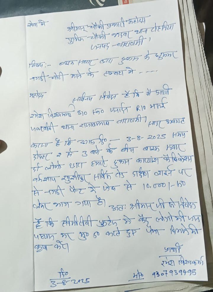 वाराणसी/-रोहनिया थाना क्षेत्र के खुशीपुर स्थित भूँसा गोदाम के ठीक सामने दक्षिण दिशा में सर्विस रोड पर संचालित बेल्डिंग के दुकान में घुसकर बाइक सवार दो युवकों ने पैंट के जेब से दस हजार नकदी पर हाथ साफ कर दिया है,घटना वारदात पूरी तरह से दुकान मालिक के सीसीटीवी फुटेज में कैद हो गया है।प्राप्त जानकारी के अनुसार राजातालाब थाना क्षेत्र के मरुई जक्खिनी निवासी रमेश विश्वकर्मा की बेल्डिंग की दुकान खुशीपुर में काव्यांश फैब्रिकेशन वर्कशॉप के नाम से संचालित होता है पर रविवार को दोपहर दो से तीन बजे के करीब एक बाइक पर सवार दो युवक पहुँचे और सीधे बेल्डिंग के दुकान में चले गए जहाँ पैंट की जेब मे रखे पर्स को लेकर भाग निकले पीड़ित रमेश विश्वकर्मा ने रोहनिया पुलिस को दिए तहरीर में बताया कि पर्स में दस हजार रुपये सहित अन्य जरूरी कागजात भी थे जिसको बाइक सवारों ने लेकर रफू चक्कर हो गए।