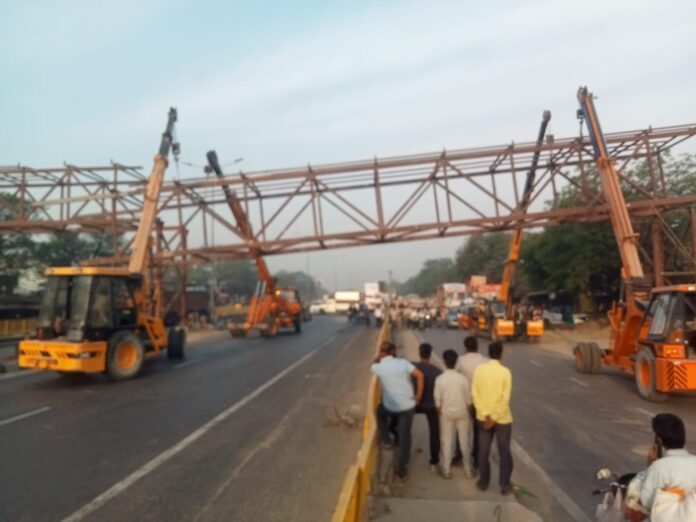 वाराणसी/-रोहनिया क्षेत्र के मोहनसराय हाईवे स्थित चौराहे पर राहगीरों को पैदल चौराहा पार करने हेतु बनाये जा रहे फुट ओवर ब्रिज के निर्माण कार्य के दौरान क्रेन द्वारा सेटिंग करते मंगलवार की भोर से 7 बजे सुबह तक लगभग दो घंटा हाईवे पर वाहनों का आवागमन बाधित रहा।जिससे हाईवे तथा सर्विस रोड पर वाहनों की लंबी कतार लग गयी जिसके दौरान राहगीरों को काफी दिक्कतों का सामना करना पड़ा।पैदल फुट ओवर ब्रिज निर्माण के लिए बगल में पहले से ही नीचे जमीन पर लोहे के गटर को कर्मचारियों द्वारा वेल्डिंग कर दो भागों में बनाया गया था जिसे हाईवे पर बनाए गए पिलर पर रखकर सेटिंग करने के लिए कर्मचारियों ने वाहनों का आवागमन रोक कर चार क्रेन की मदद से कुशलता पूर्वक हाईवे के दोनों तरफ बने लोहे के पिलर पर सेटिंग किया गया।इस दौरान लगभग दो घंटे बाद वाहनों का आवागमन सुचारू रूप से चालू हुआ।