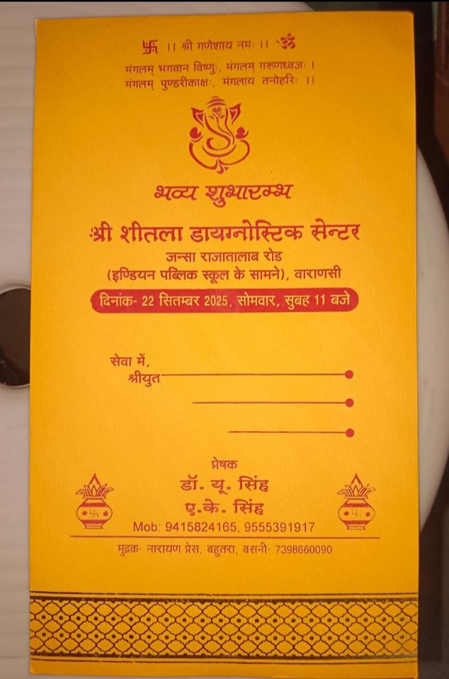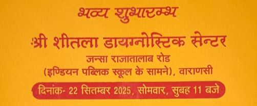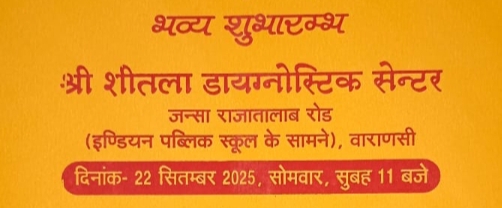 शारदीय नवरात्रि के प्रथम दिन श्री शीतला डायग्नोस्टिक सेंटर के भव्य शुभारंभ के पावन अवसर पर मुख्य अतिथि के रूप में व्यापार मंडल के प्रदेश अध्यक्ष शिव कुमार गुप्ता जी व विशिष्ट अतिथि के रूप में जिलाध्यक्ष व्यापार मंडल वाराणसी ग्रामीण व जंसा व्यापार मंडल अध्यक्ष शुभम सिंह सहित सैकड़ों डॉक्टर जनप्रतिनिधि पत्रकार साथी उपस्थित रहेंगे।