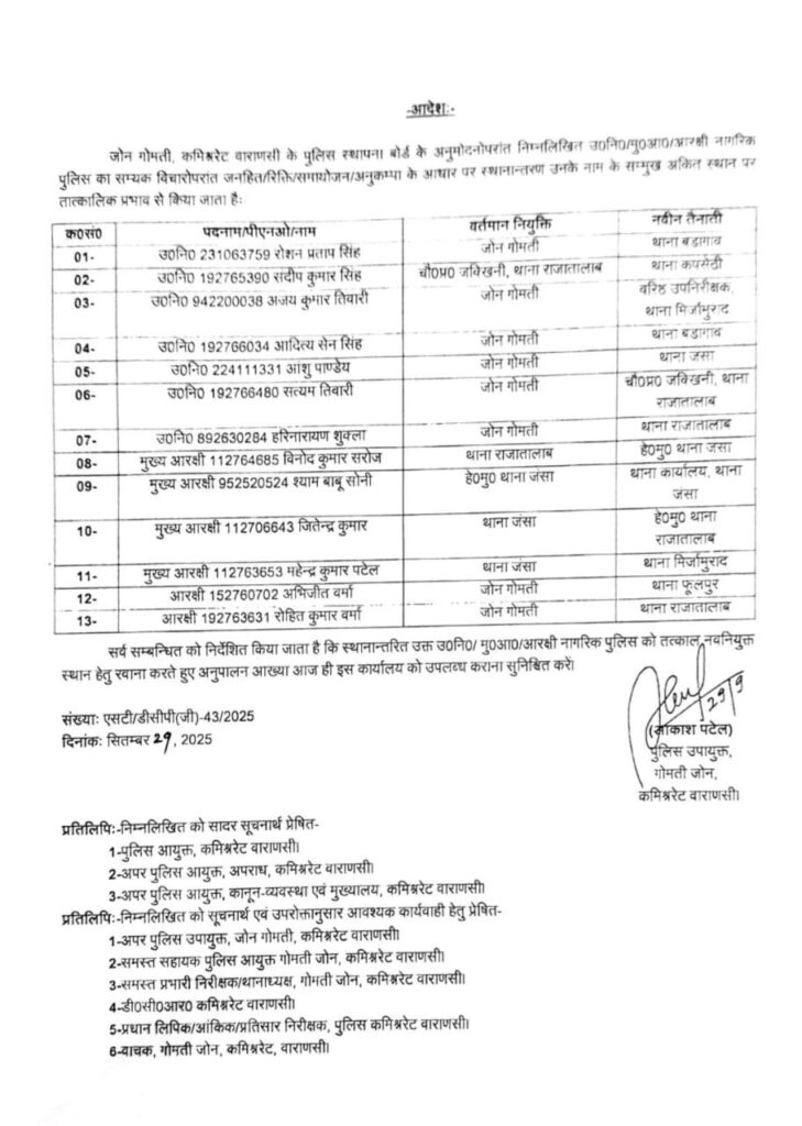 वाराणसी/-वाराणसी कमिश्नरेट पुलिस गोमती जोन में एक चौकी प्रभारी समेत सात उपनिरीक्षकों व आधा दर्जन आरक्षी मुख्य आरक्षियों का स्थानांतरण किया गया है।प्राप्त जानकारी के अनुसार सोमवार को पुलिस उपायुक्त गोमती जोन आकाश पटेल ने चौकी प्रभारी जक्खिनी थाना राजातालाब सहित 13 पुलिसकर्मियों के कार्यक्षेत्र में बदलाव करते हुए उन्हें तत्काल नए तैनाती स्थल पर कार्यभार ग्रहण करने के आदेश दिए हैं। पुलिस स्थापना बोर्ड की संस्तुति और रिक्तियों के सापेक्ष एसआई व कांस्टेबल/हेड कांस्टेबल का ट्रांसफर किया गया है।