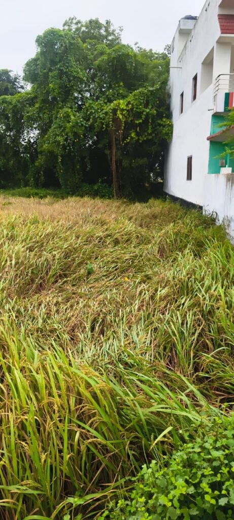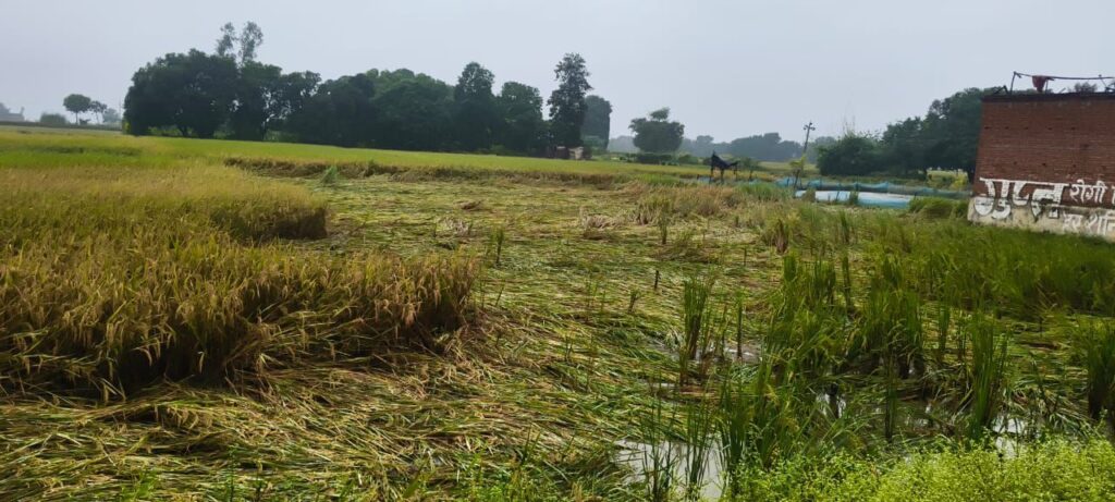 वाराणसी/-राजातालाब क्षेत्र में पिछले दो दिनों से हो रही बे-मौसम बारिश ने किसानों की उम्मीदों पर पानी फेर दिया है। कटाई के कगार पर खड़ी धान की फसल को भारी नुकसान पहुँचा है। खेतों में पानी भर जाने से फसलें गिर गईं और कई जगहों पर दाने काले पड़ने लगे हैं।किसानों का कहना है कि वे पूरे साल मेहनत करके फसल तैयार करते हैं, लेकिन इस बार अचानक हुई बारिश ने सब कुछ बर्बाद कर दिया।